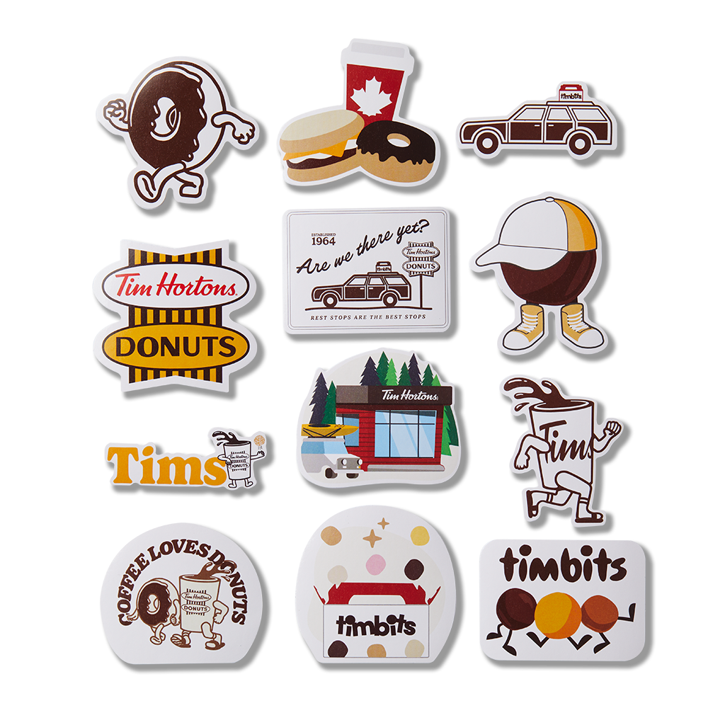 You’re never too old for stickers. This fun sticker pack is designed to help you show your love for all things Canada and Tims. featuring 12 retro Tim Hortons designs. Stick em’ where you’ll see ’em and sit back to enjoy the view.